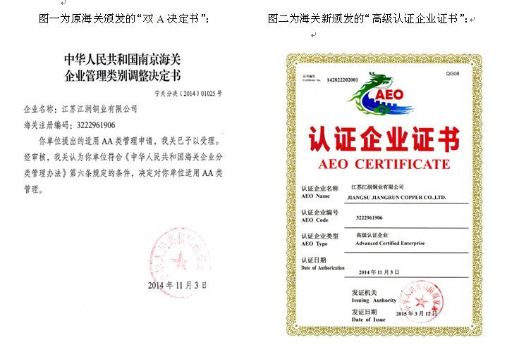 2015年7月30日,由無錫關檢貿組織的“共創共建”啟動儀式在無錫隆重舉行,參會企業共十五家。會議議程為原無錫市15家海關AA類管理的企業直接過渡為海關高級認證企業。江蘇江潤銅業有限公司榮獲由南京海關頒發的“高級認證企業”的稱號,公司總經理駱偉棟參會并領獎?!吨腥A人民共和國海關企業信用管理暫行辦法》去年12月1日實施后,海關注冊企業的管理類別從原來的AA、A、B、C、D類劃分,改為按企業信用狀況劃分為認證企業、一般信用企業和失信企業,其中認證企業又分為一般認證企業和高級認證企業。認證企業在通關時適用較低的貨物查驗率,單證審核程序相對簡化,并可以優先辦理海關通關手續?! 「呒壵J證企業,除享有一般認證企業的通關便利外,其進出口貨物在確定商品歸類、原產地確定、海關估價和辦結其他海關手續前可先行驗放,由海關統一設立協調員,提供便捷通關服務。走出國門后,高級認證企業更可享受與中國實現AEO互認國家或地區海關提供的通關便利,這相當于直接獲得一張在全球有關國家或地區快速通關的VIP卡。